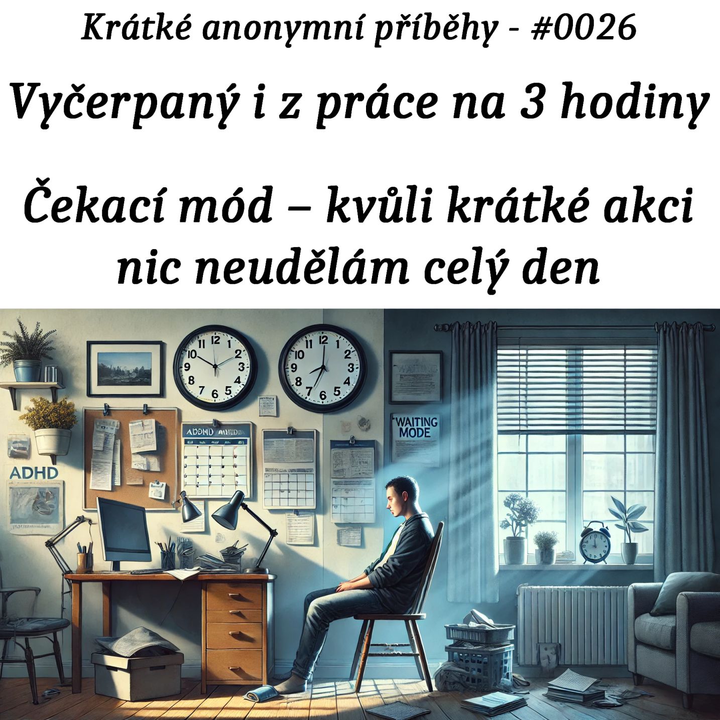 Výborně, moc díky. Teď prosím obrázek k příběhu člověka, pro kterého je náročné i jít do práce a z práce a pracovat i tři hodiny, a který kvůli odpolední schůzce nebo akci celé dopoledne nic neudělá ani nezařídí. Čekací mód ADHD, paralýza. Vyčerpaný i z práce na 3 hodiny Čekací mód – kvůli krátké akci nic neudělám celý den