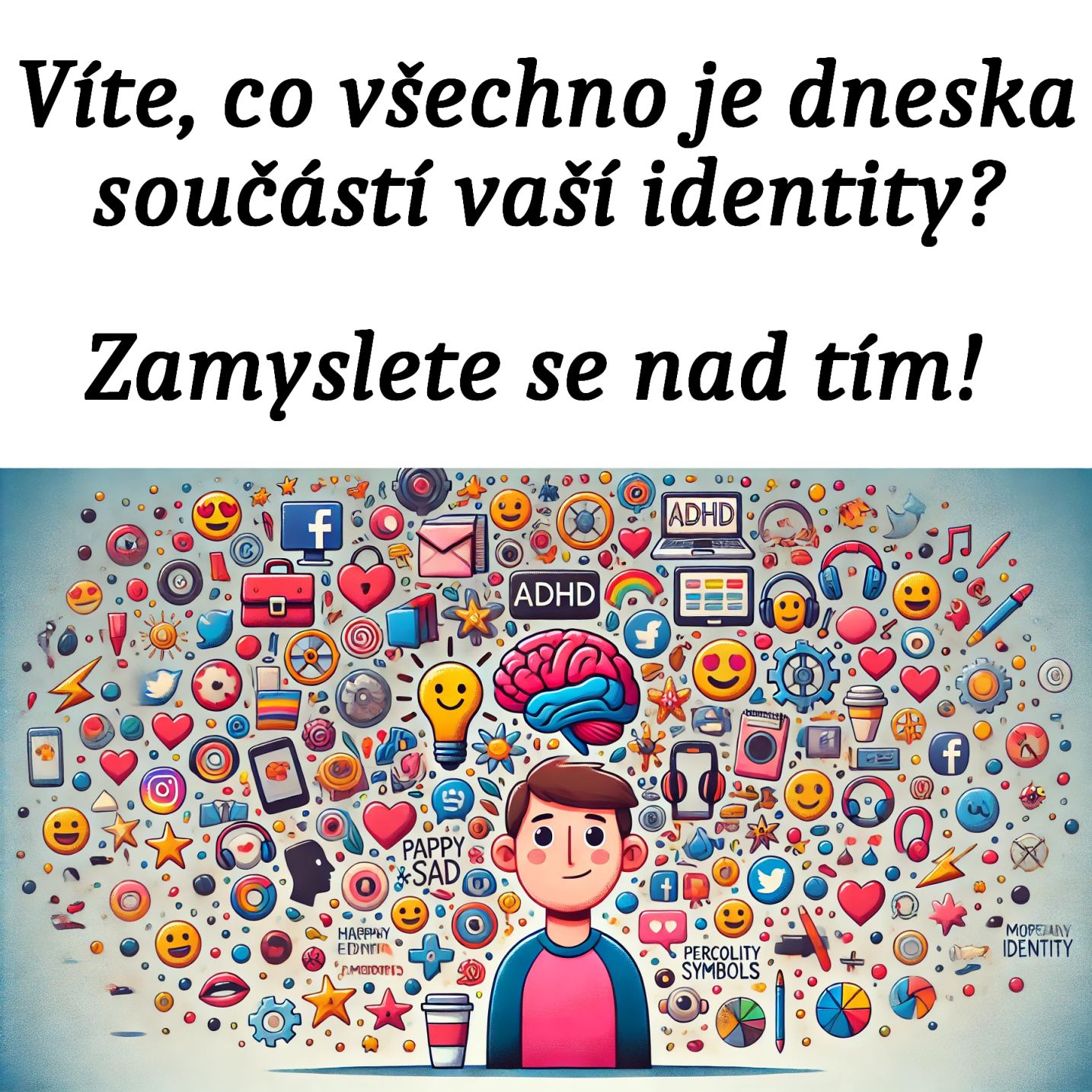 Prosím závěrečné pohlazení a povzbuzení a humor v sekci I. A potom zvlášť v další odpovědi důkladné shrnutí do sekce A (vždycky dávám shrnutí úplně na začátek pro ty, kdo nemůžou číst dál).Moc díky. Prosím článek (hlavně) pro lidi s ADHD na téma: "Víte, co všechno je dneska součástí vaší identity? Zamyslete se nad tím!" ----- Jde o to, že máme problém se svým já, se svým sebevědomím. A to dokonce i když ADHD přijmeme a smíříme se s ním. Měl by to být článek plný humoru, ale současně hluboké zamyšlení nad sami sebou a zahrnout i psychologické pohledy na hledání identity. ----- A teď prosím z pohledu toho, jak se vážně hledá a buduje identita na základě psychologie, ale pořád s humorem a nadsázkou. A můžeš to naplánovat a rozdělit na víc sekcí, počínaje sekcí D. ----------- Prosím každou sekci zvlášť rozpracovat pořádně do podrobností se zajímavými příklady na zamyšlení. ----- Hm, je pravda, že identita se mění. Ale člověk nemůže být jenom proměnlivá snůška drobností. Pořebuje ve své osobnosti mít nějakou kotvu. Stabilní část, která ho drží pohormadě. Jeho hodnoty a dlouhodobé vlastnosti. Dobré i "špatné", se kterými se nějak smířil. Dal bys mi, prosím, ještě sekci (nebo víc sekcí podle potřeby) o tom, jak si v sobě najít a vybudovat tu kotvu, jádro? ----- Ach jo, pořád to není všechno. Ještě prosím sekci o psychologickém pohledu na to členění "já" na tři části - id, a já nevím jaké dvě další. ----- Super, moc díky. Teď prosím obrázek k humornému, ale psychologicky hlubokému článku (hlavně) pro lidi s ADHD na téma: "Víte, co všechno je dneska součástí vaší identity? Zamyslete se nad tím!" ----- Víte, co všechno je dneska součástí vaší identity? Zamyslete se nad tím!