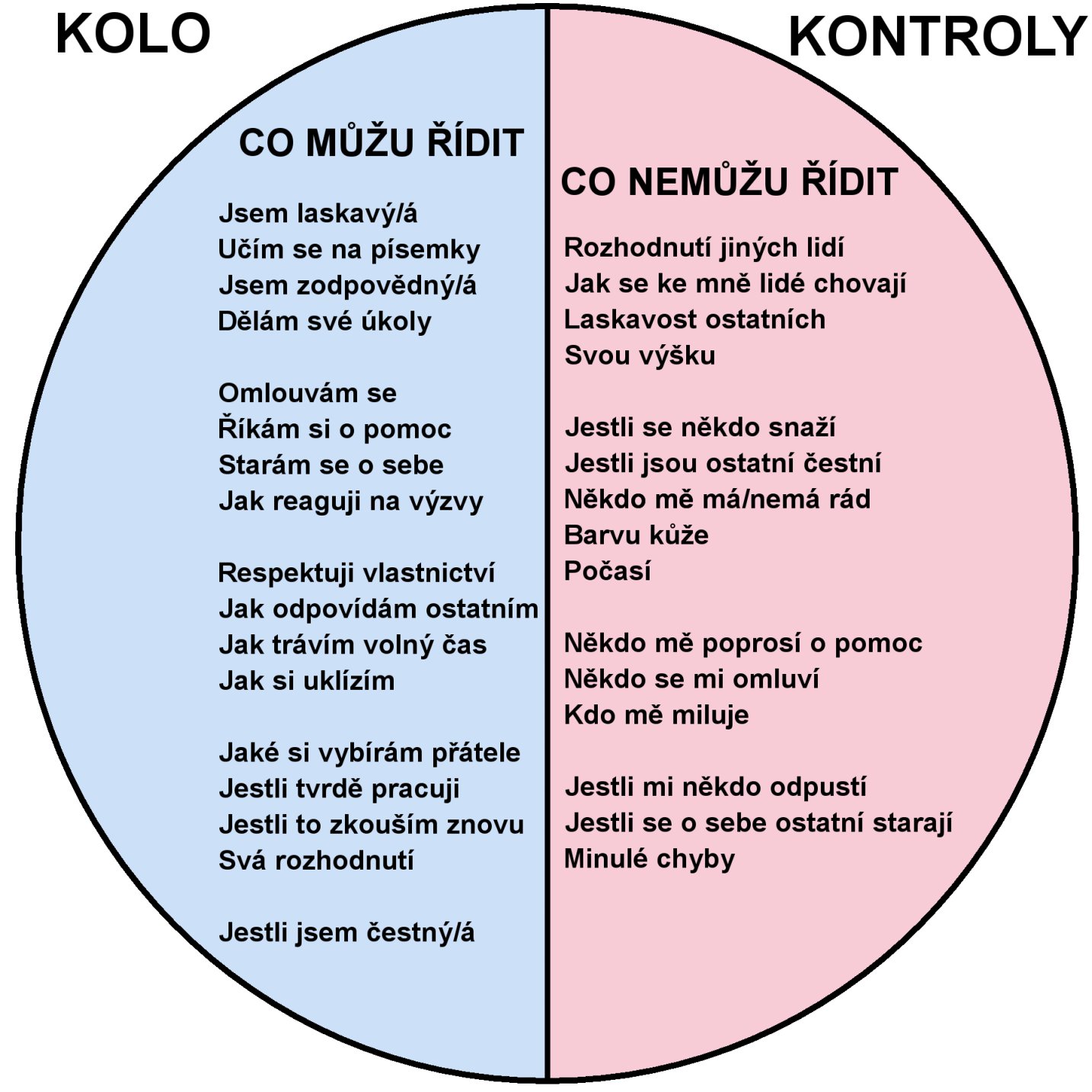 ----- KOLO KONTROLY CO MŮŽU ŘÍDIT Jsem laskavý/á Učím se na písemky Jsem zodpovědný/á Dělám své úkoly Omlouvám se Říkám si o pomoc Starám se o sebe Jak reaguji na výzvy Respektuji vlastnictví Jak lidem odpovídám Jak trávím volný čas Jak si uklízím Jaké si vybírám přátele Jestli tvrdě pracuji Jestli to zkouším znovu Svá rozhodnutí Jestli jsem čestný/á CO NEMŮŽU ŘÍDIT Rozhodnutí jiných lidí Jak se ke mně lidé chovají Laskavost ostatních Svou výšku Jestli se někdo snaží Jestli jsou ostatní čestní Někdo mě má/nemá rád Barvu kůže Někdo mě poprosí o pomoc Někdo se mi omluví Kdo mě miluje Počasí Jestli mi někdo odpustí Jestli se o sebe ostatní starají Minulé chyby