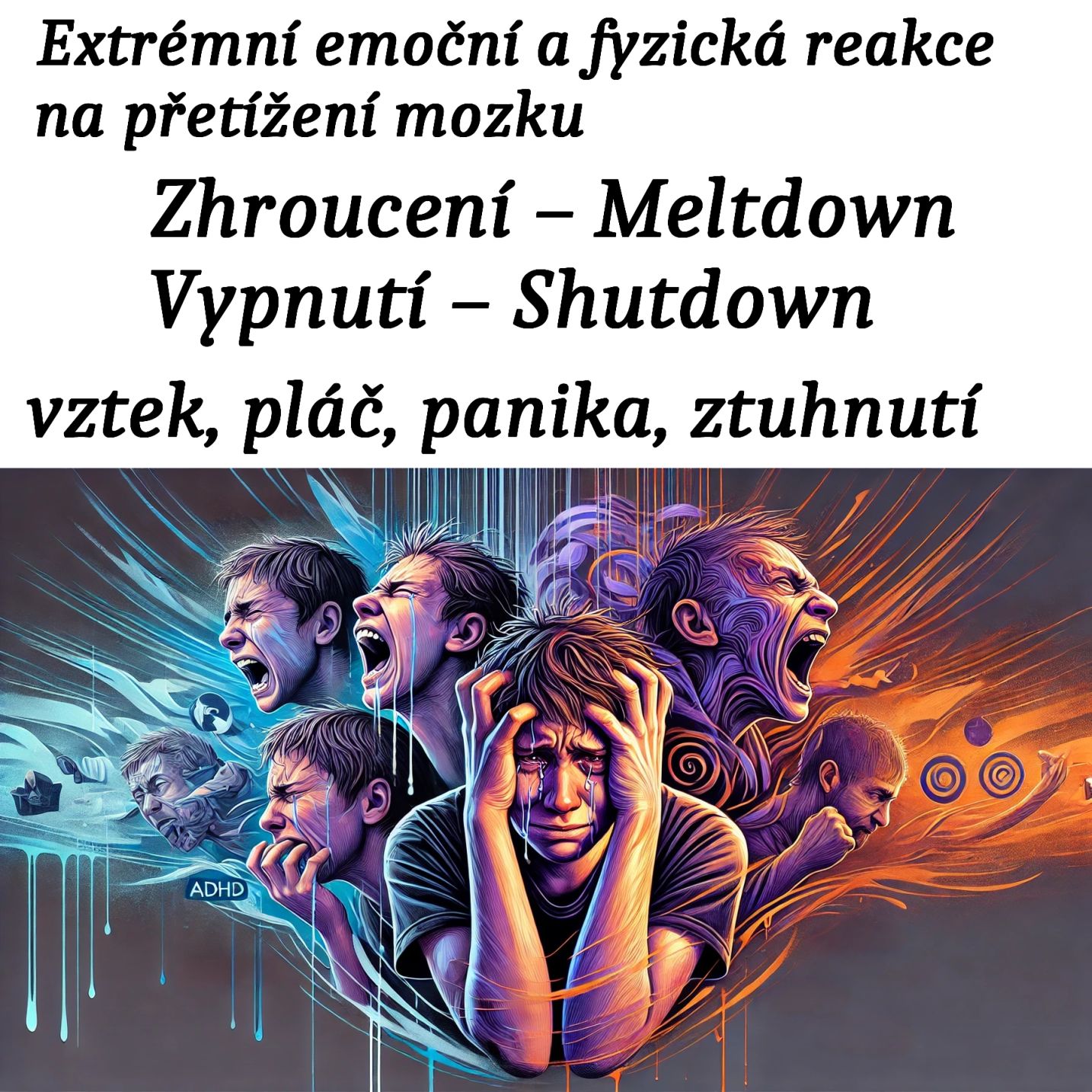 | Meltdown (emoční zhroucení) | Přetížení mozku emocemi nebo podněty | Výbuch vzteku, pláč, křik, únik | Nekontrolovatelná reakce, člověk ji neovládá |